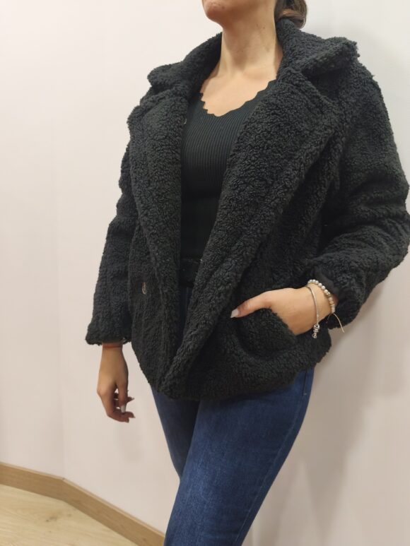 Bomber combinada en color negro con cierre frontal de cremallera y corchetes. Capucha escondida en el cuello con cremallera invisible. Bolsillos laterales con cremalleras.