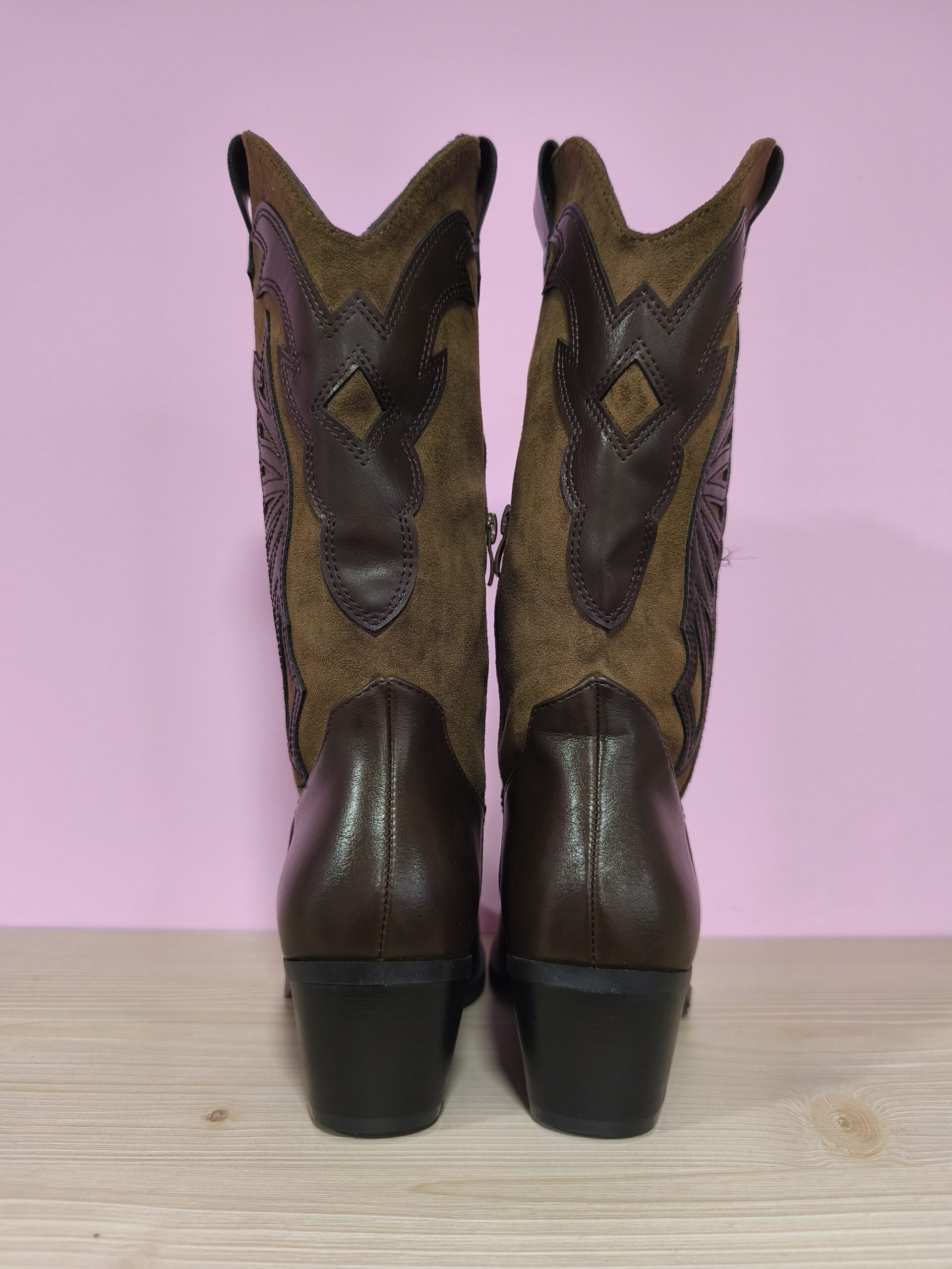 Bota campera de caña media en color chocolate. Combina piel con ante y tiene un diseño muy bonito.