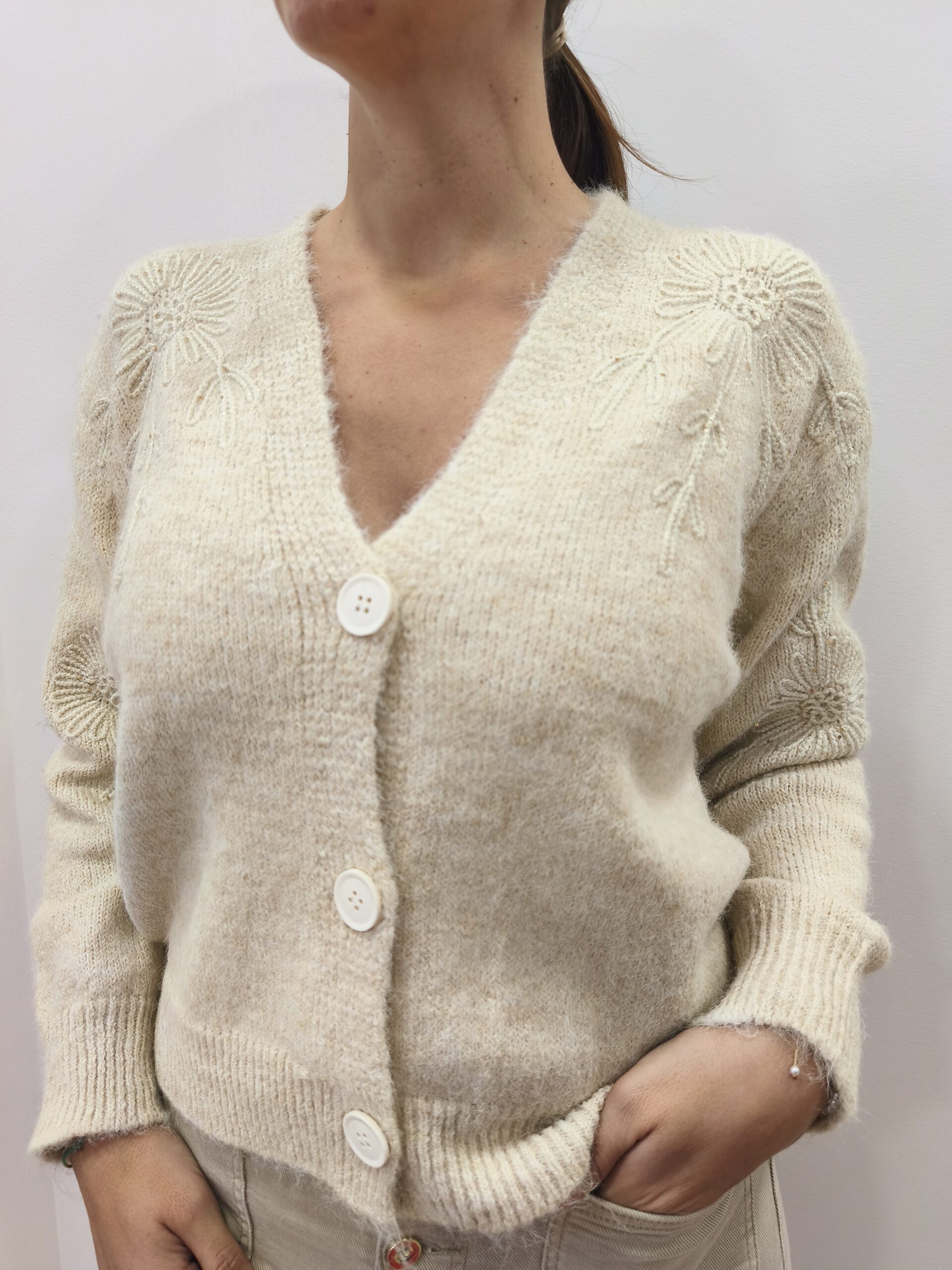 Chaqueta básica de punto en tono beige, con bordados y destellos en los hombros