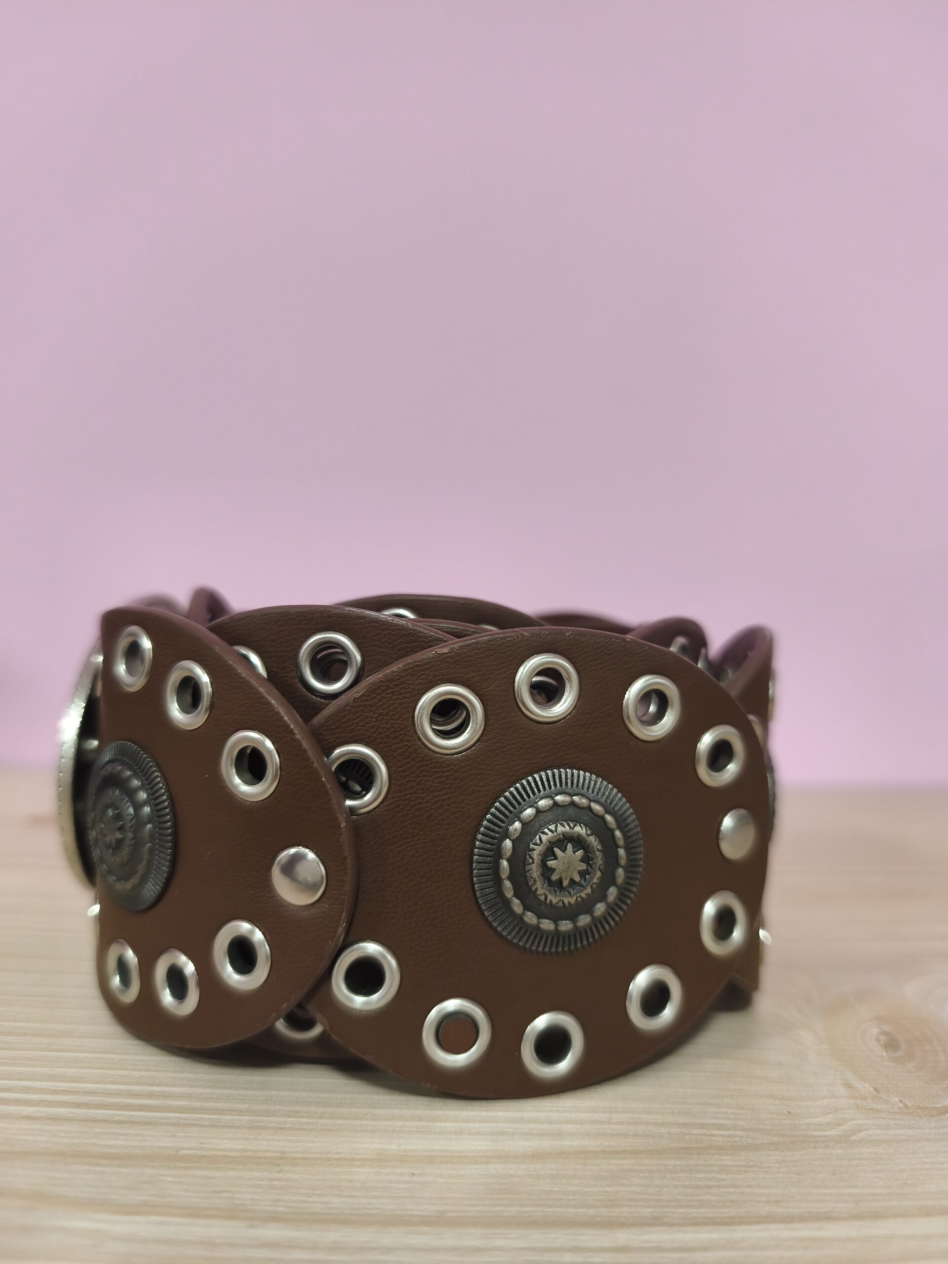 Cinturón marrón estilo 2000s con tachuelas y un rollazo increíble.
