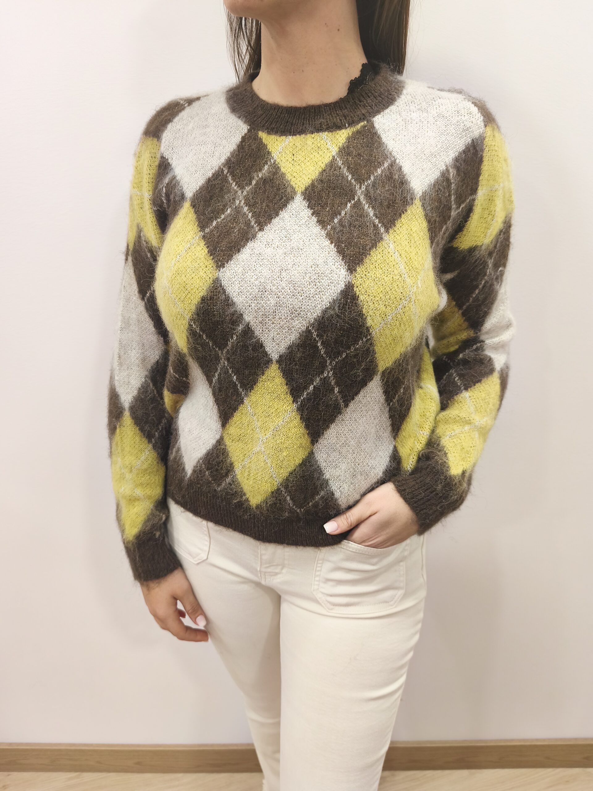 Jersey de rombos en marrón chocolate, beige y amarillo con cuello redondo, puños y bajo elástico.